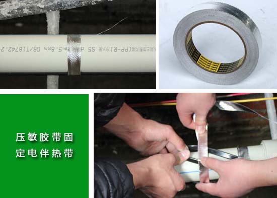 压敏胶带是一种特殊类型的胶带,将一种特殊胶粘剂(压敏胶)涂于带状基材上制成。由压敏胶、基材、底胶、背面处理剂等构成。在电伴热系统中,电伴热带安装后,用该耐热压敏胶带每沿管道300mm横向将电伴热带固定牢,其配备长度视伴热管道长度而定。